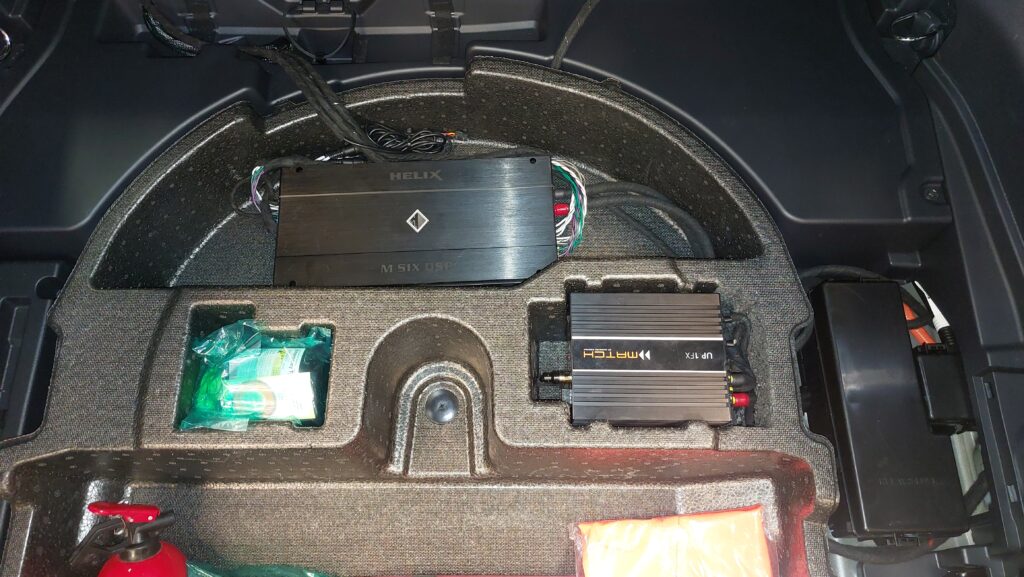 Všechno běží aktivně přes zesilovač Helix MSIX DSP, ukrytý šikovně pod podlážkou kufru. Ano, nezabírá místo a ano, nebudete se muset vzdát ani jedné tašky s nákupem.
