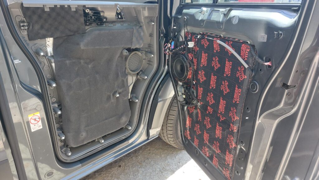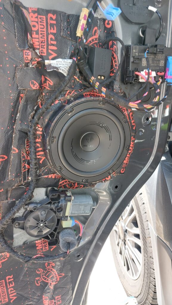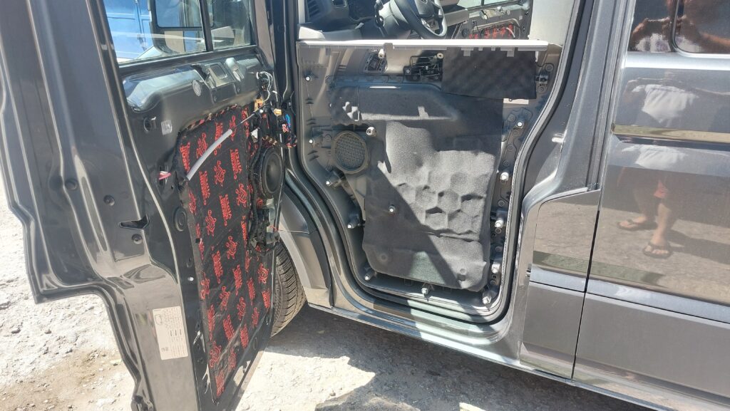 Základem celé instalace bylo precizní vytlumení dveří pomocí profesionálních materiálů Comformat. Pečlivě provedené tlumení hraje v akustice zásadní roli – dveře se promění v pevnou ozvučnici, která eliminuje rezonance a umožní reproduktorům pracovat s maximální přesností. Výsledkem je pevný, čistý a přirozený zvuk, který působí mnohem sebevědoměji než původní tovární systém.