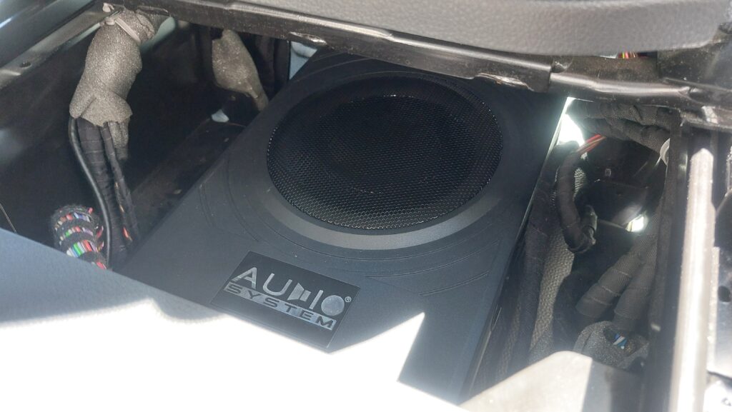 Pro doplnění nízkých frekvencí jsme použili aktivní subwoofer Audio System US 08 Active, který se perfektně vešel pod sedadlo řidiče. Tento kompaktní woofer dodává celé sestavě potřebnou hloubku a energii, aniž by zabíral místo v obytné části vozu.