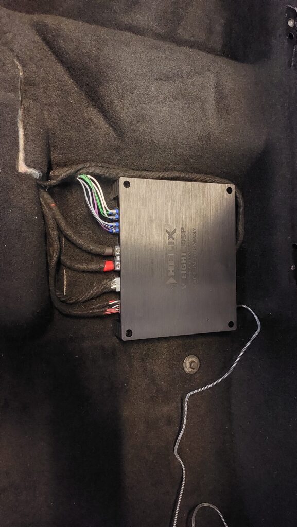 Základem systému je zesilovač Helix V Eight DSP, který řídí vše s chirurgickou přesností. Na předních dveřích hrají Helix 165 Ci7 doplněné o výškové reproduktory Helix Ci5, vzadu pak Helix 165 Ci3 společně s výškami Helix Ci3. Celé zapojení je aktivní, což znamená naprostou kontrolu nad každým měničem.